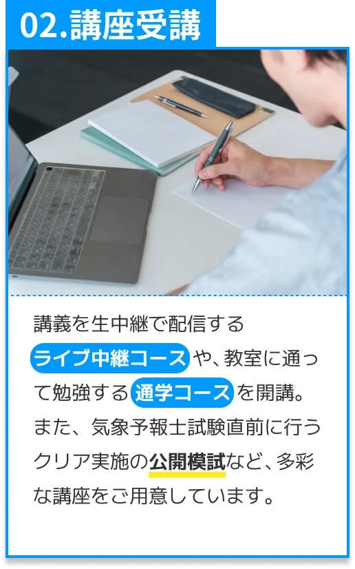 勉強を始めるにあたっての不安や疑問に答えるため、またスムーズに講義に入れるようにするため 当社では、オンラインでの「 気象予報士講座 各講座概要 説明会」を随時開催しています。 初めて勉強される方はもちろん、勉強してきた方も、より良いスタートが切れるよう、ベテラン講師が丁寧にガイドします。気軽に参加ください。